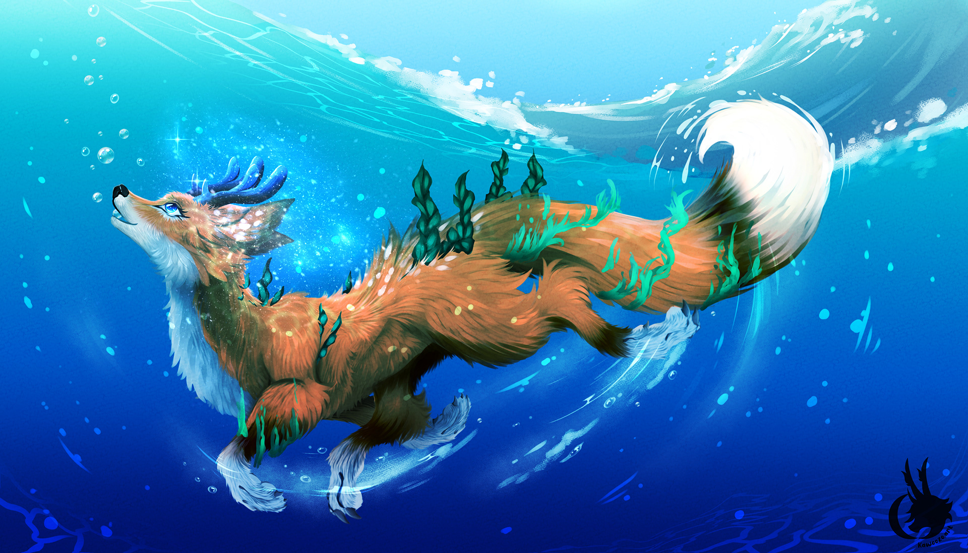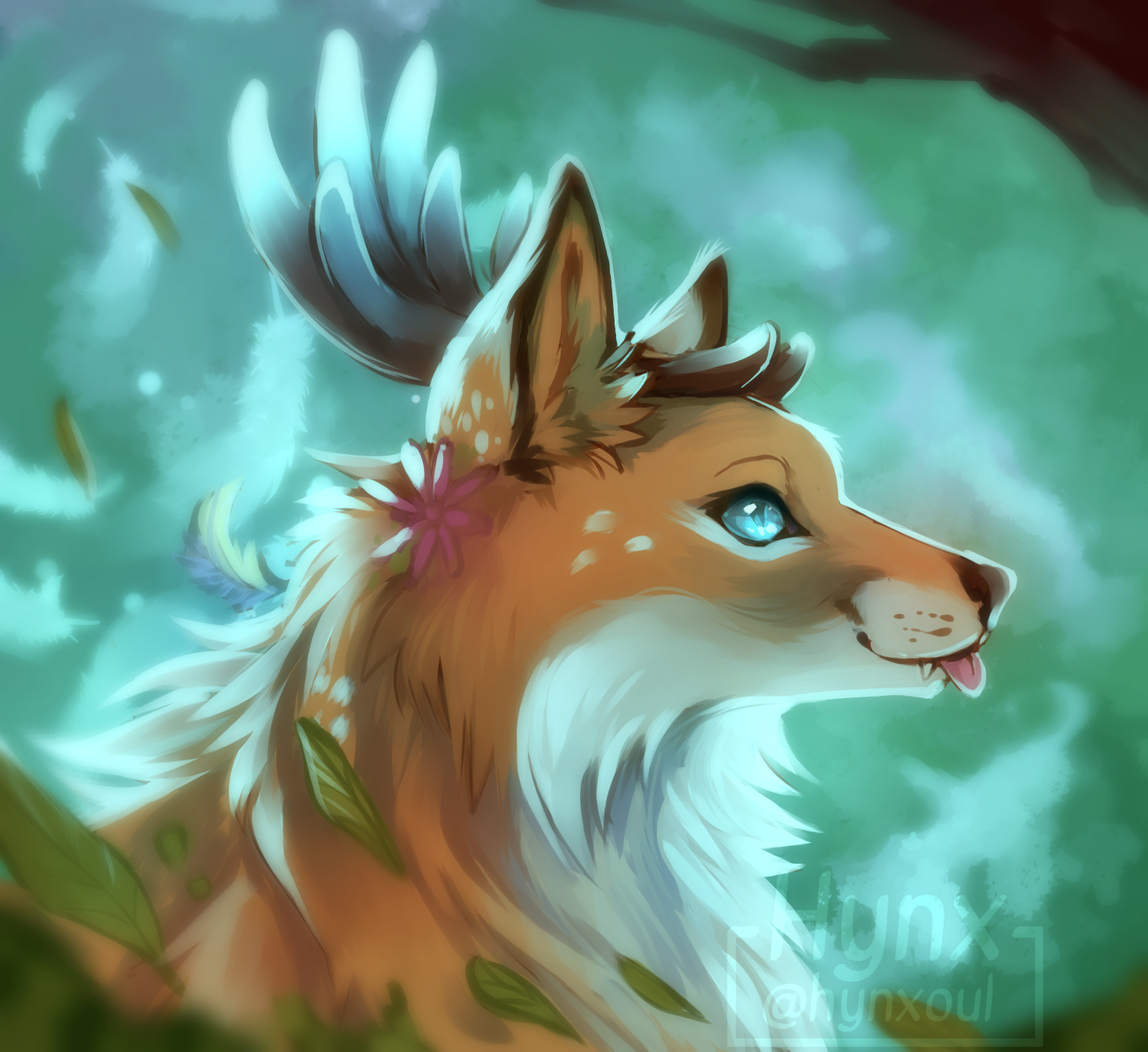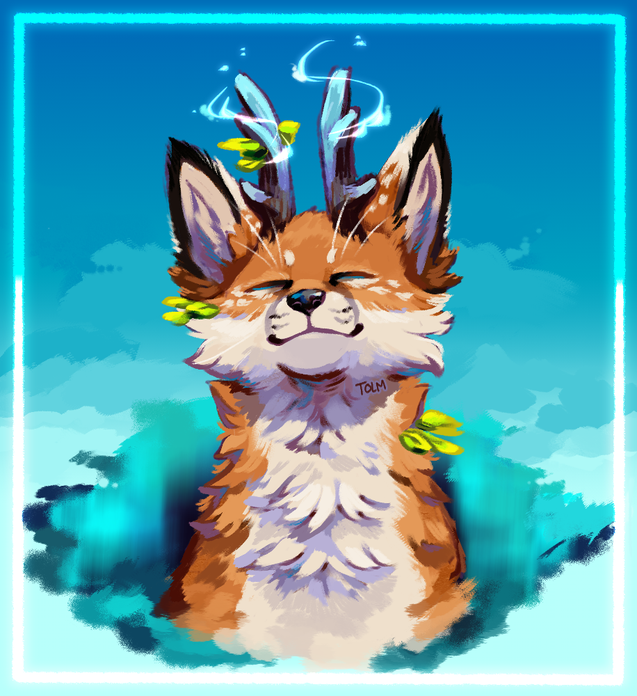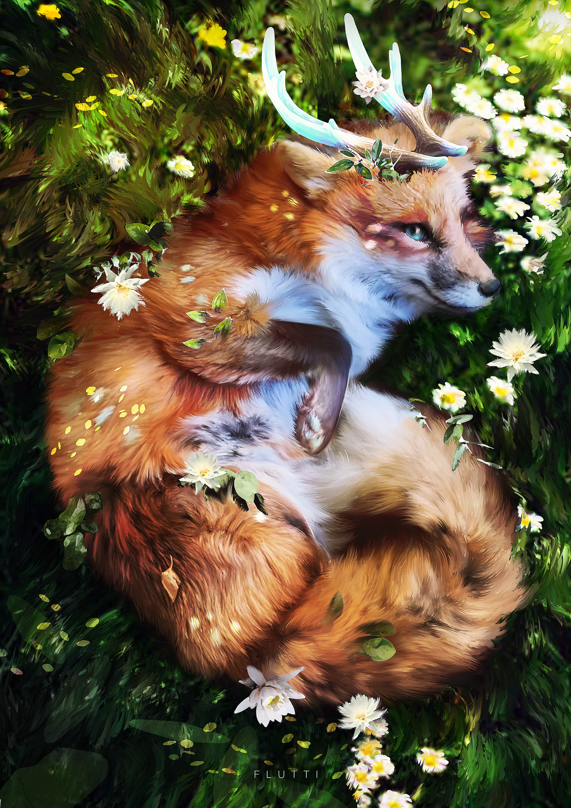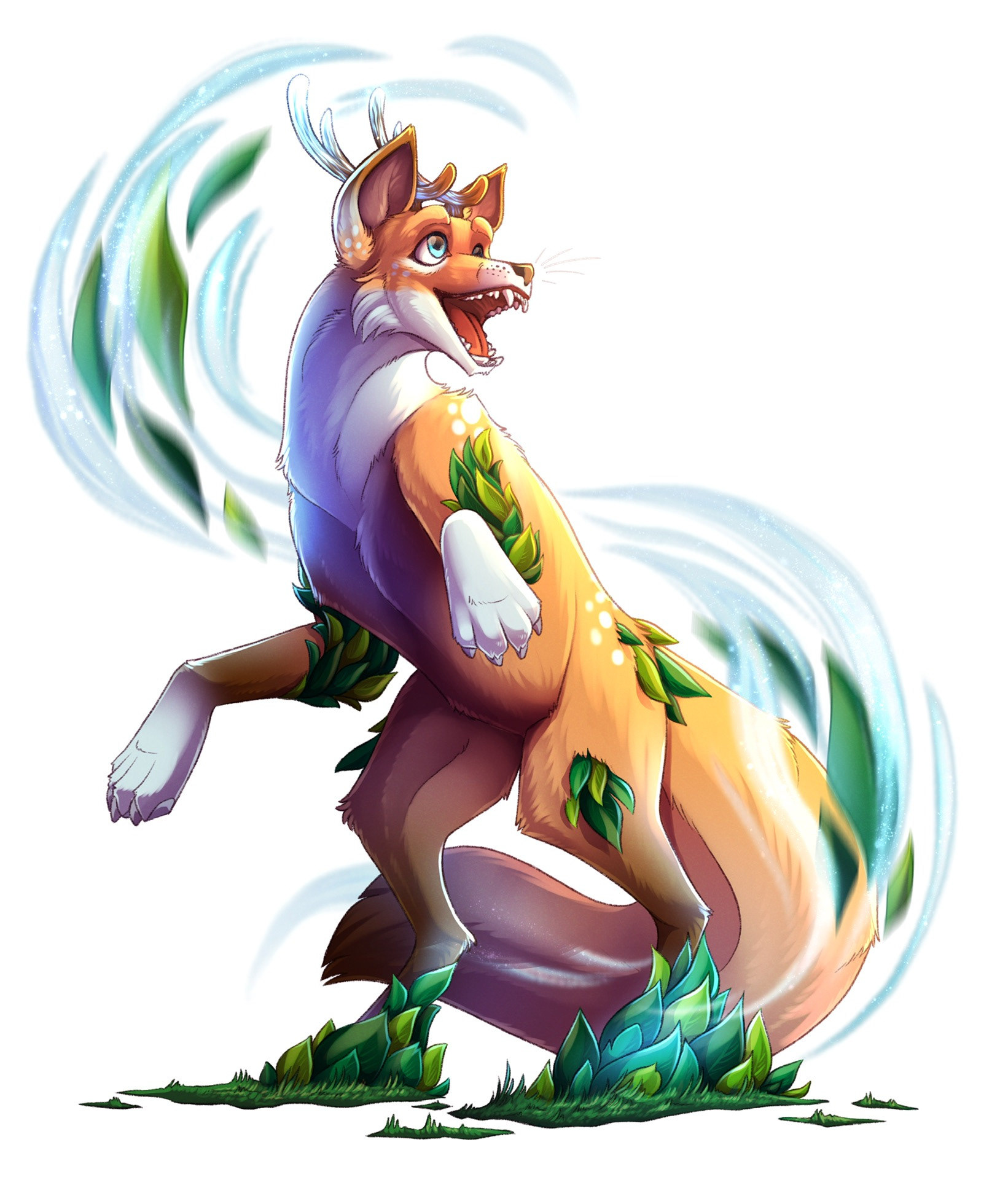 "A mythical creature with botanimalic and elemental magic qualities. As an avatar incarnation of life, her heart is filled with full of happiness, curiosity and positivity cheerfulness. This ancient spirit feels deeply connected attached to the faunal, herbal and aquatic biosphere. Endowed with the gifts of nature, her abilities comprise inter alia the growth of plants, underwater respiration and natural restoration regeneration of nature. When applying availing herself of her magical powers, her body is surrounded by blue spiritual celestial lights. As an adventurous curious soul, the ability to camouflage their identity is highly developed by local collectibles such as feathers and seasonal flowers, worn around the ear, antlers, and scattered in the fur."