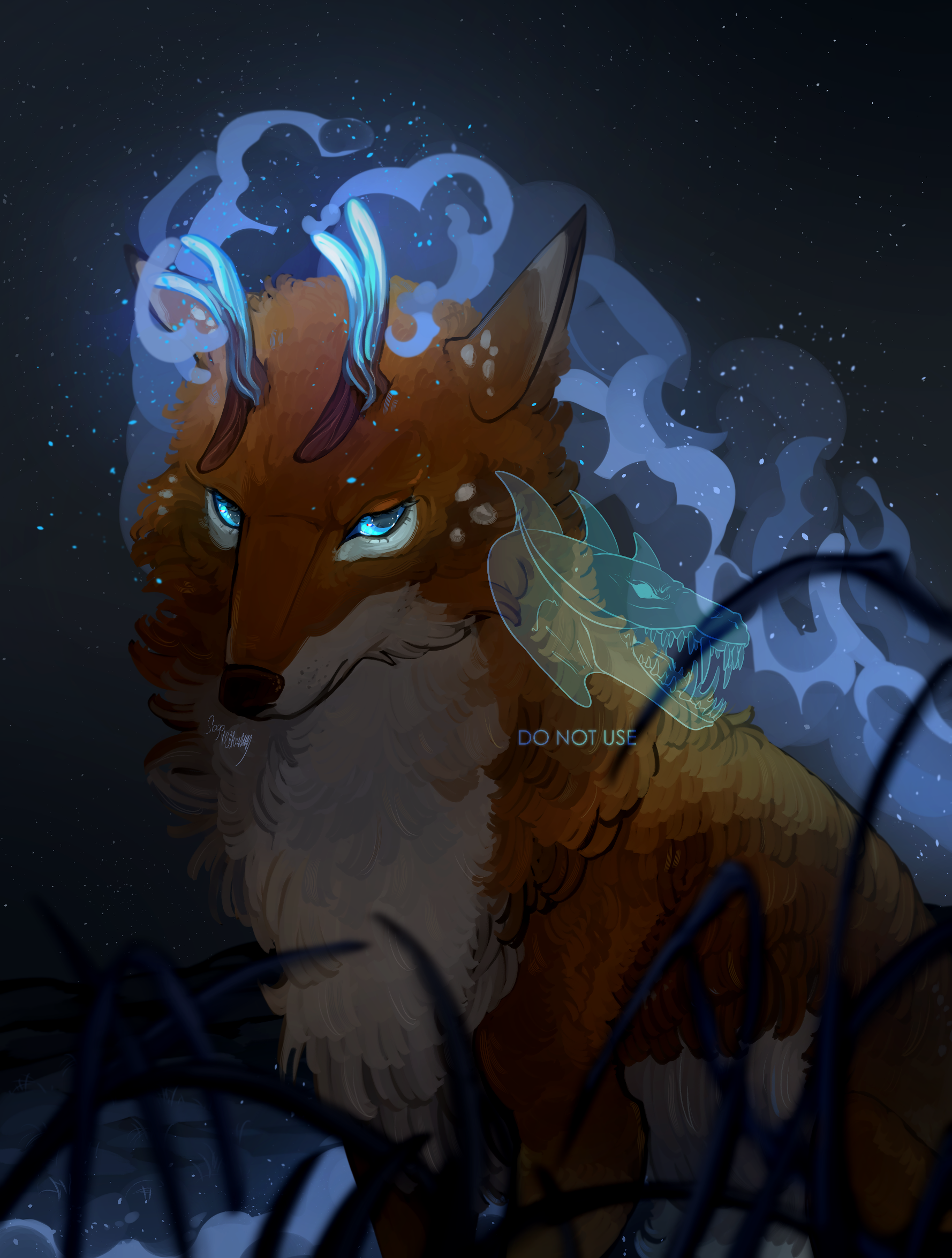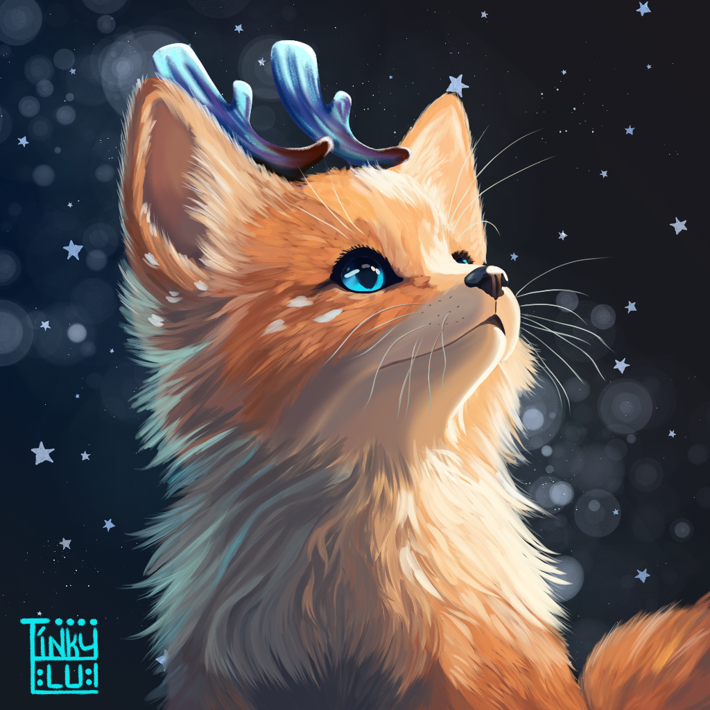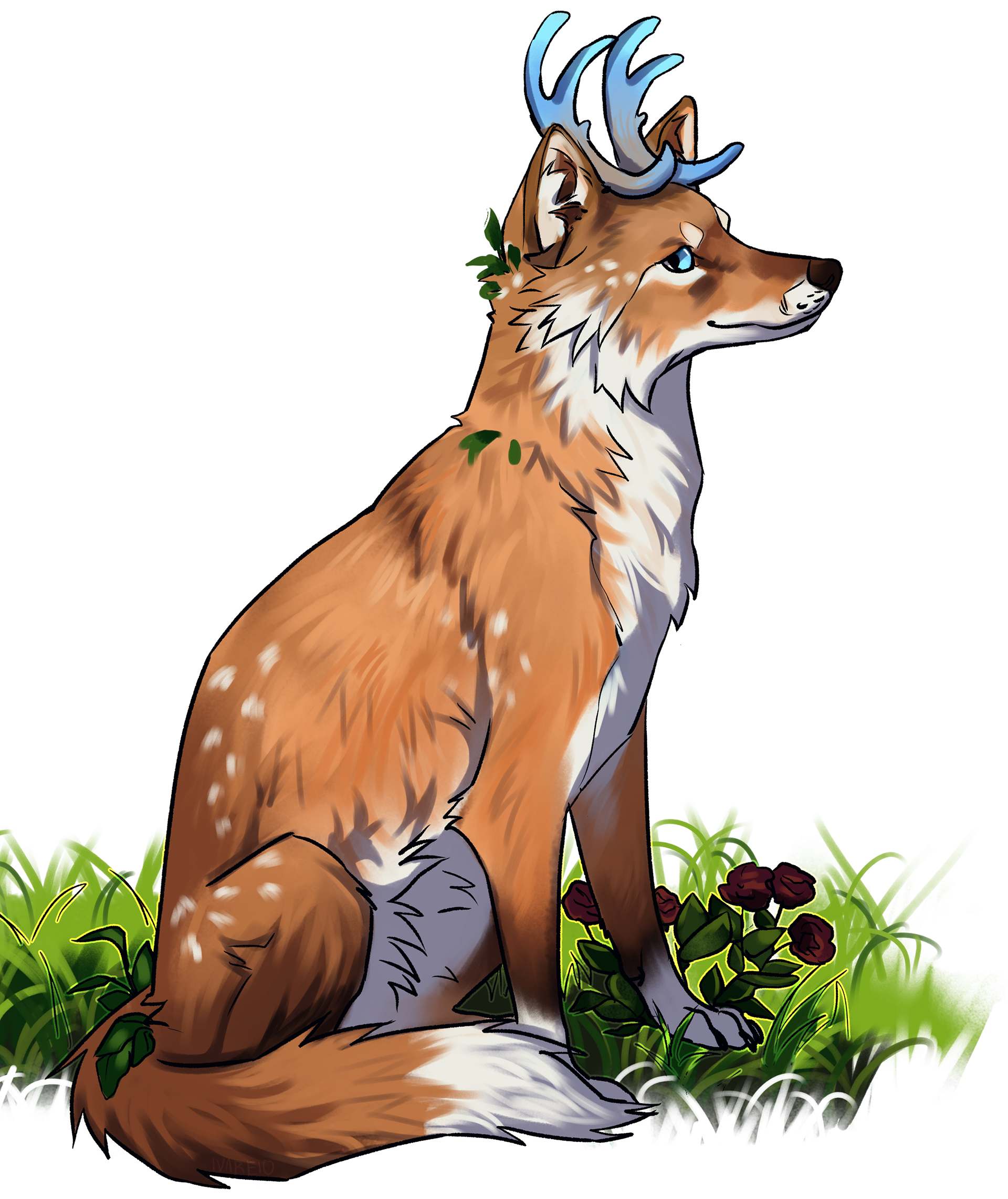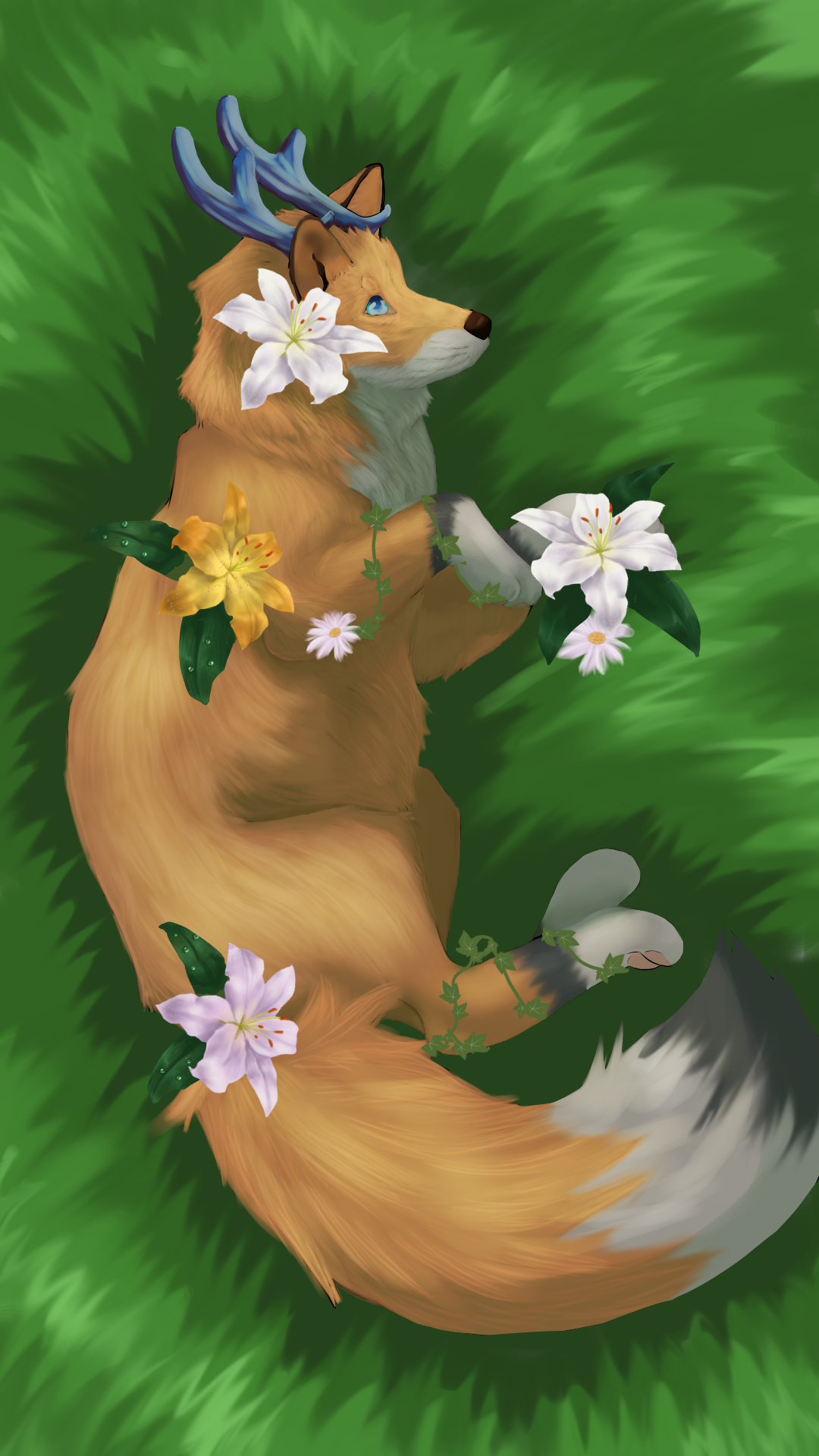 "A mythical creature with botanimalic and elemental magic qualities. As an avatar incarnation of life, her heart is filled with full of happiness, curiosity and positivity cheerfulness. This ancient spirit feels deeply connected attached to the faunal, herbal and aquatic biosphere. Endowed with the gifts of nature, her abilities comprise inter alia the growth of plants, underwater respiration and natural restoration regeneration of nature. When applying availing herself of her magical powers, her body is surrounded by blue spiritual celestial lights. As an adventurous curious soul, the ability to camouflage their identity is highly developed by local collectibles such as feathers and seasonal flowers, worn around the ear, antlers, and scattered in the fur."