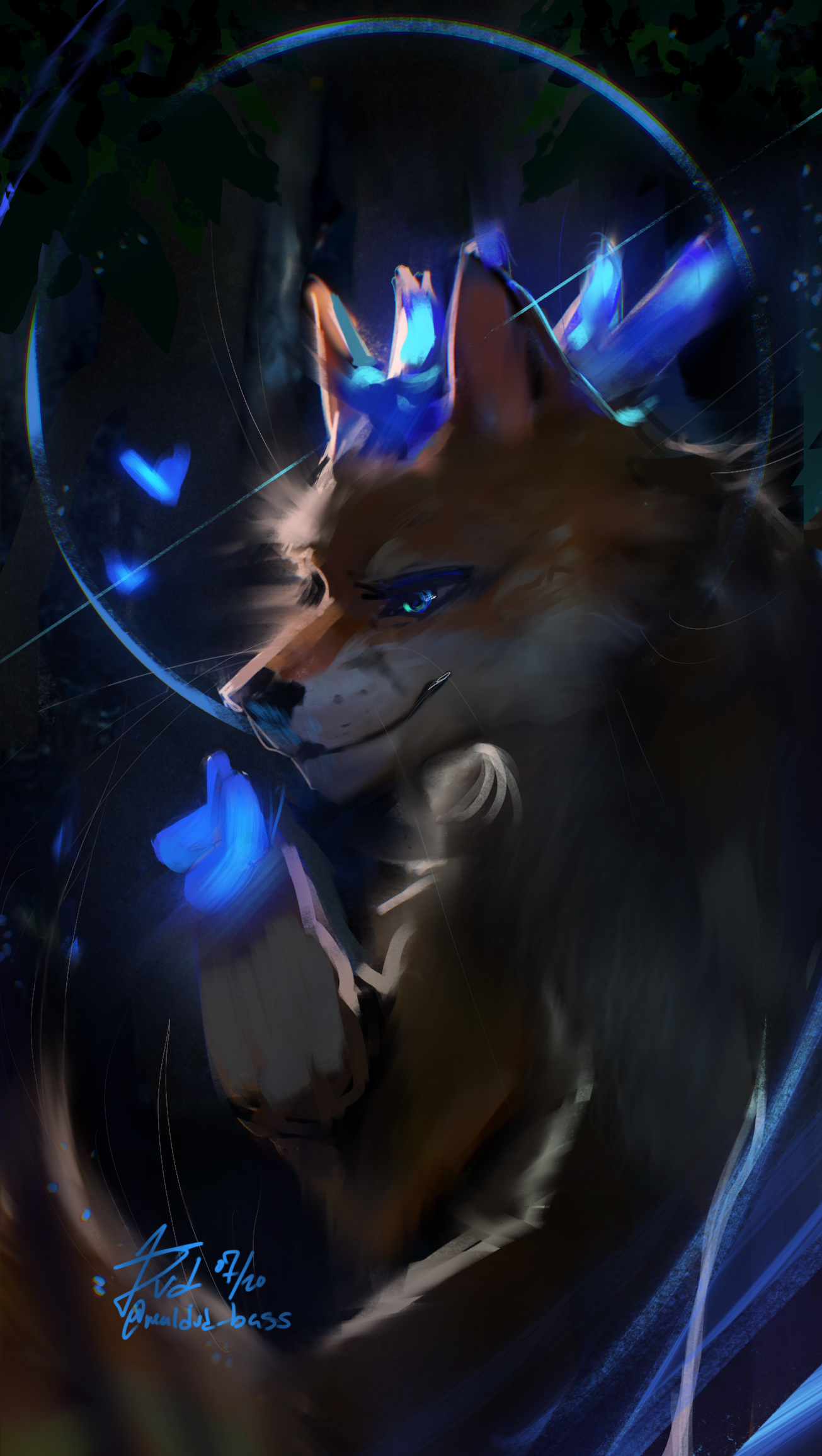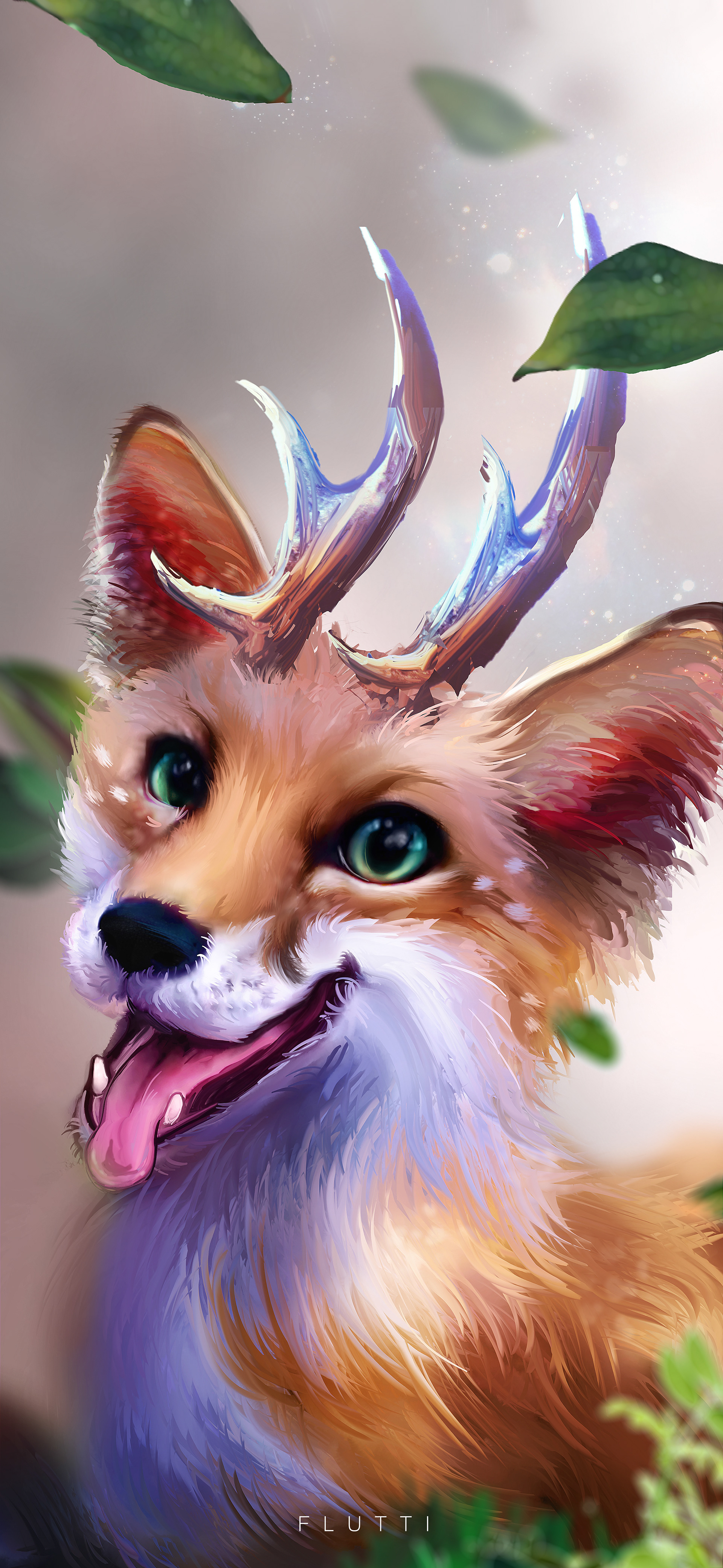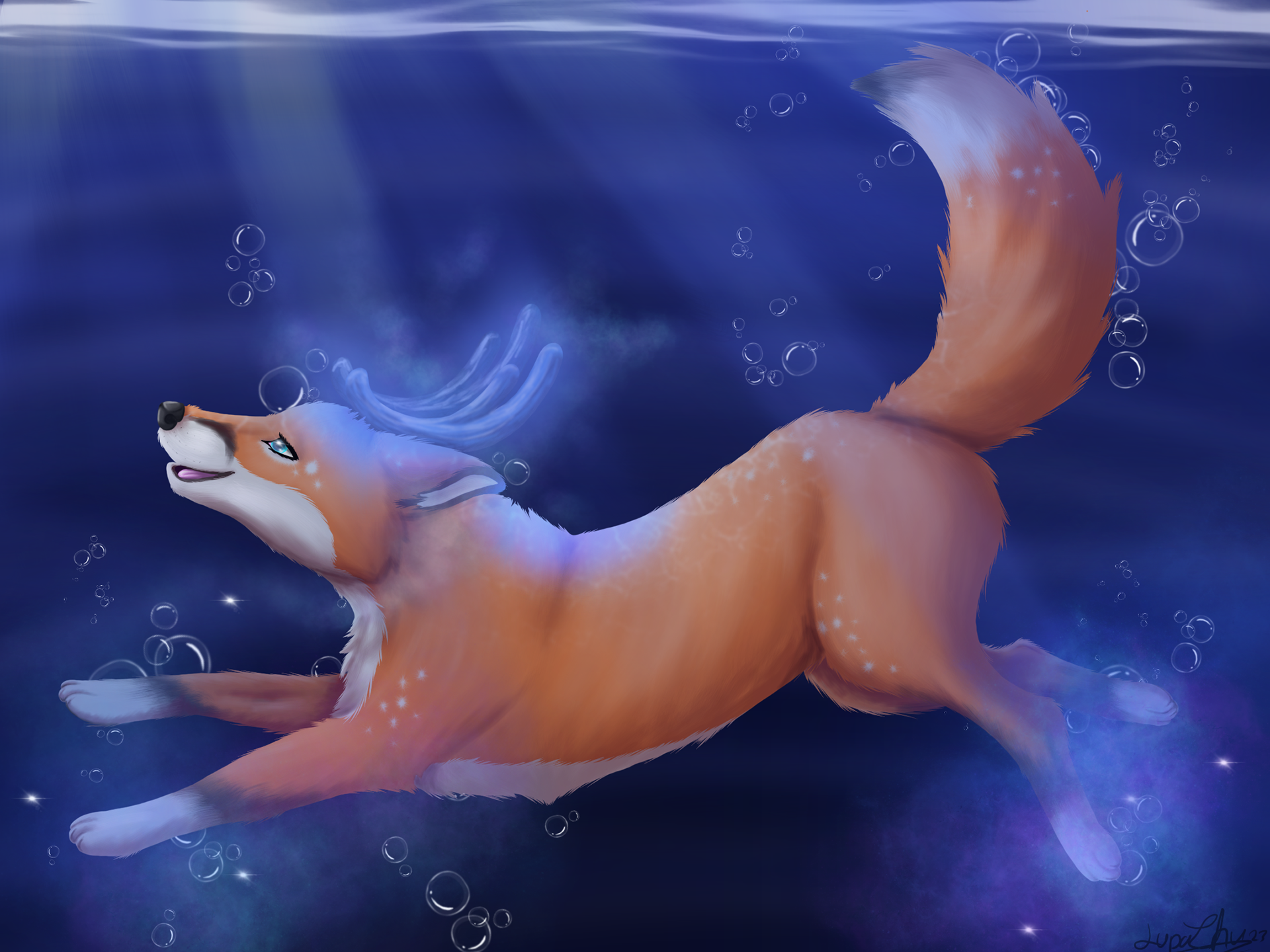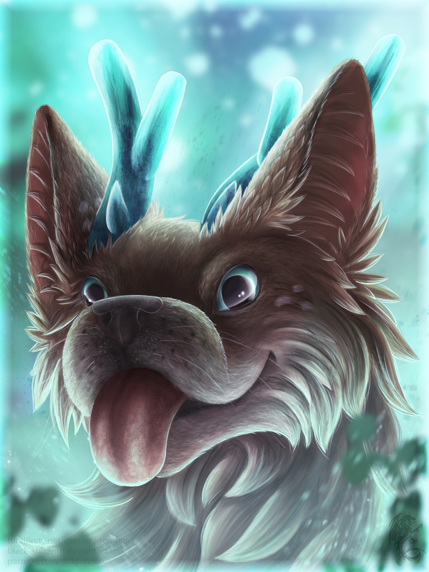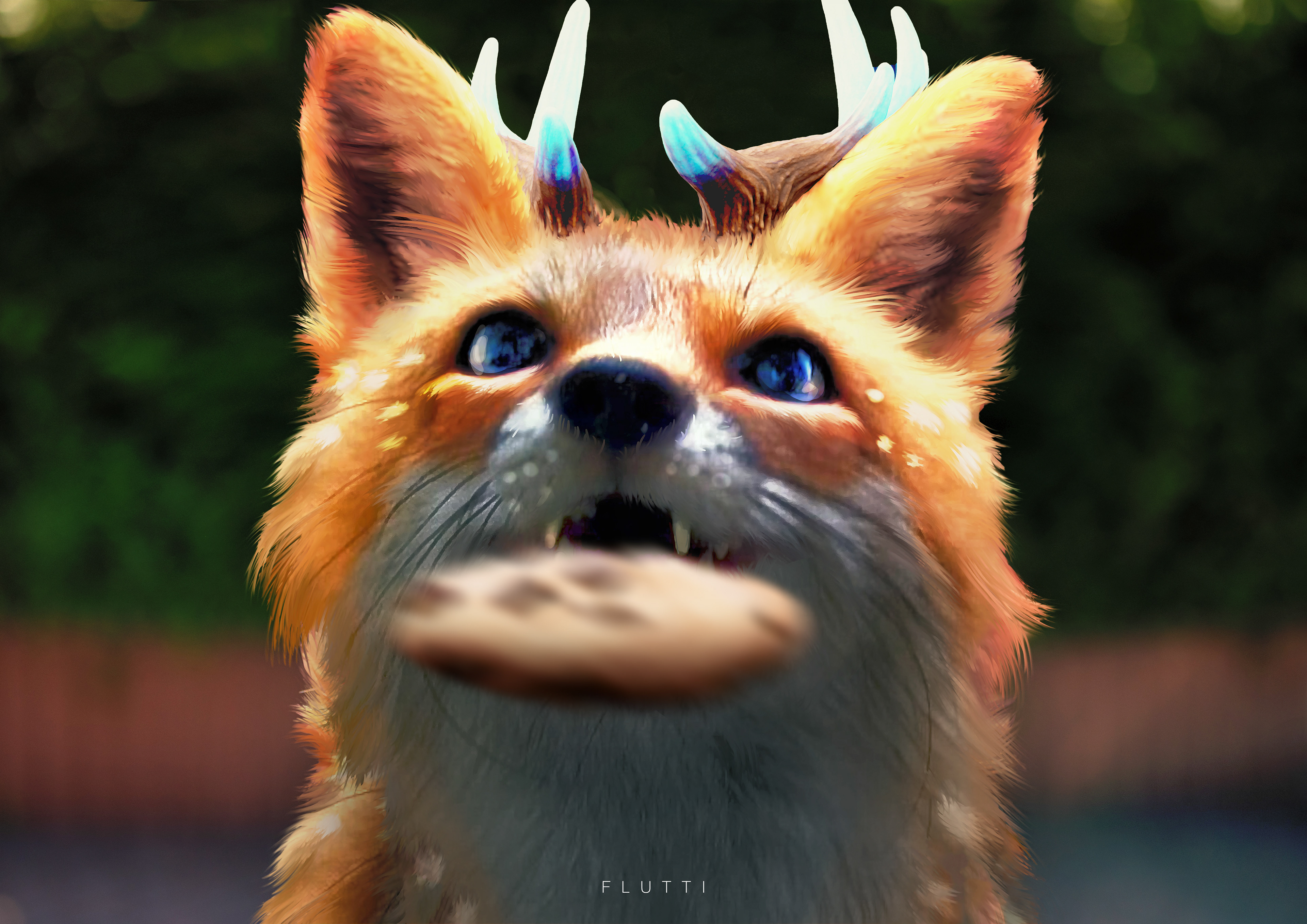"A mythical creature with botanimalic and elemental magic qualities. As an avatar incarnation of life, her heart is filled with full of happiness, curiosity and positivity cheerfulness. This ancient spirit feels deeply connected attached to the faunal, herbal and aquatic biosphere. Endowed with the gifts of nature, her abilities comprise inter alia the growth of plants, underwater respiration and natural restoration regeneration of nature. When applying availing herself of her magical powers, her body is surrounded by blue spiritual celestial lights. As an adventurous curious soul, the ability to camouflage their identity is highly developed by local collectibles such as feathers and seasonal flowers, worn around the ear, antlers, and scattered in the fur."