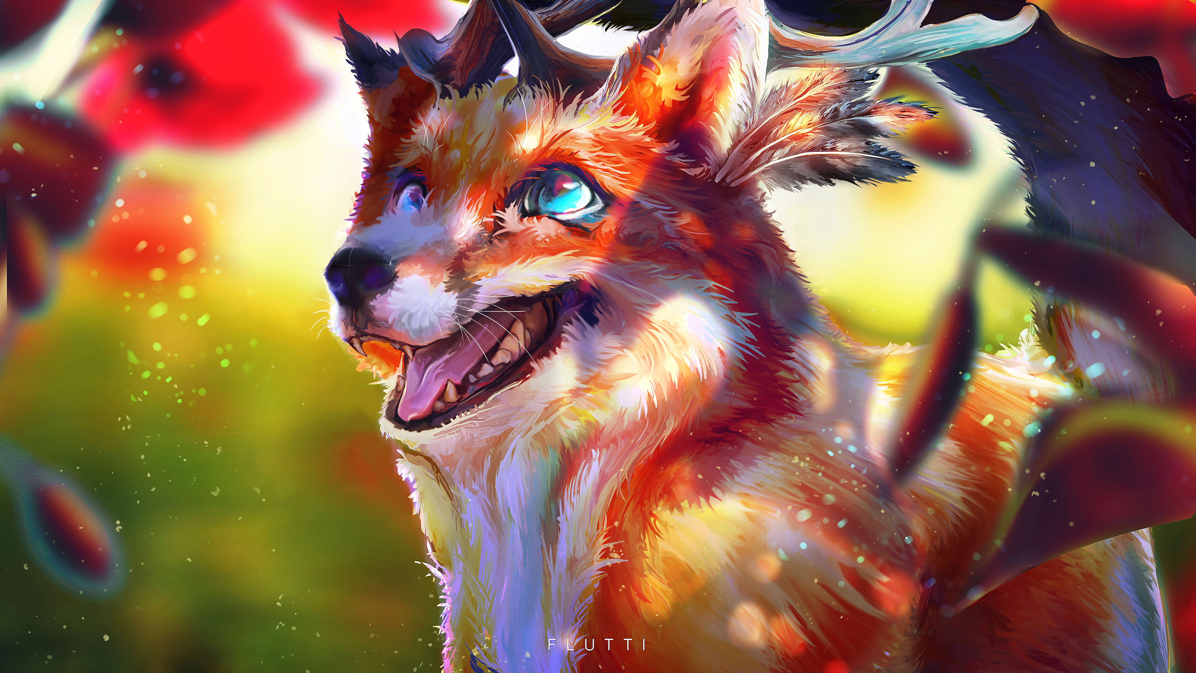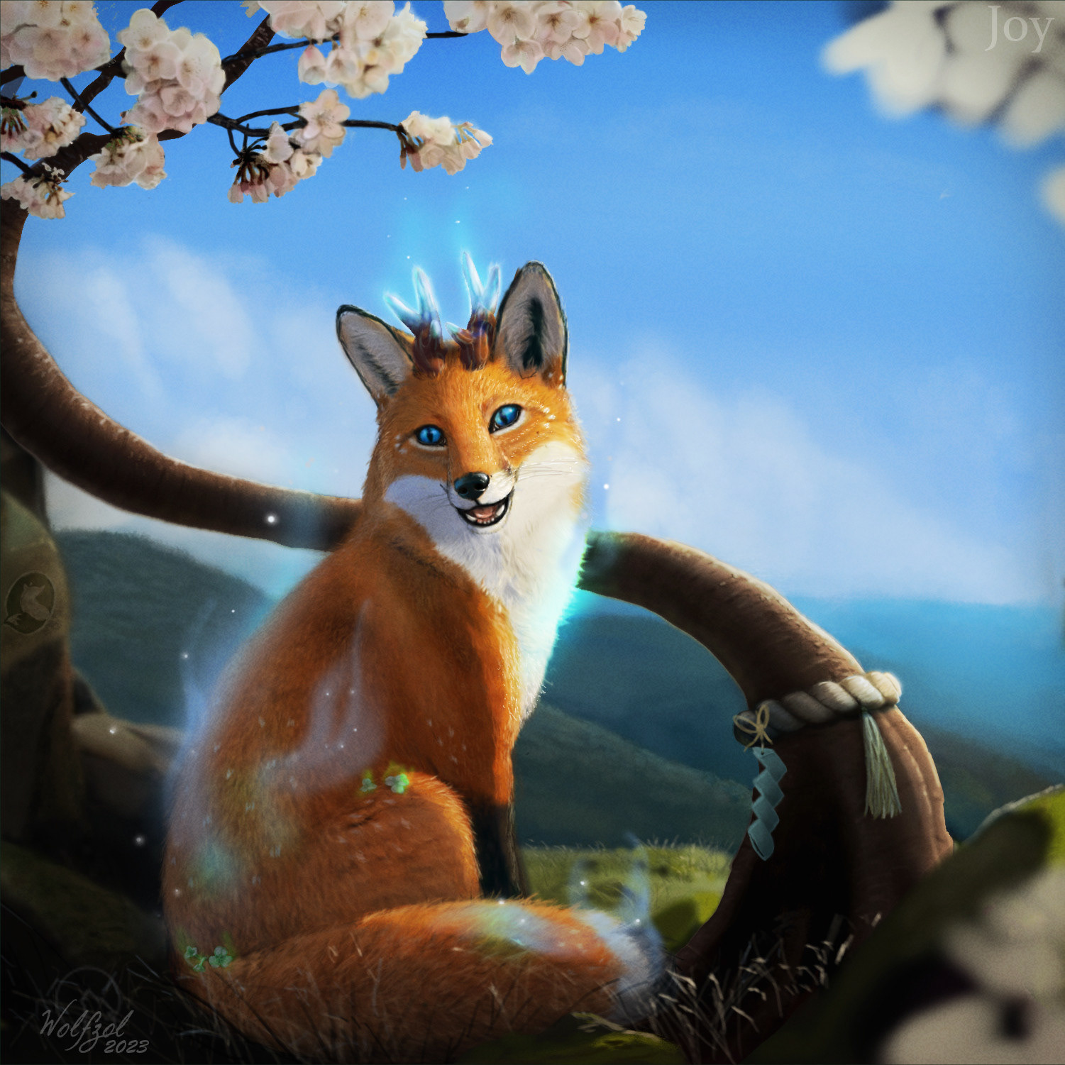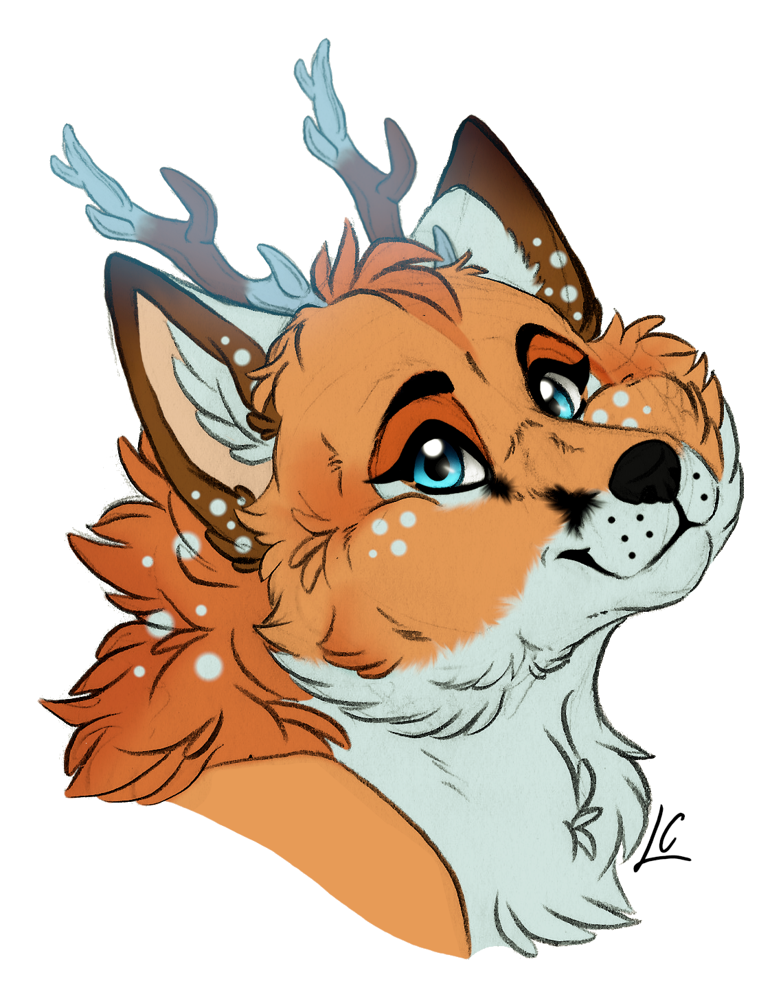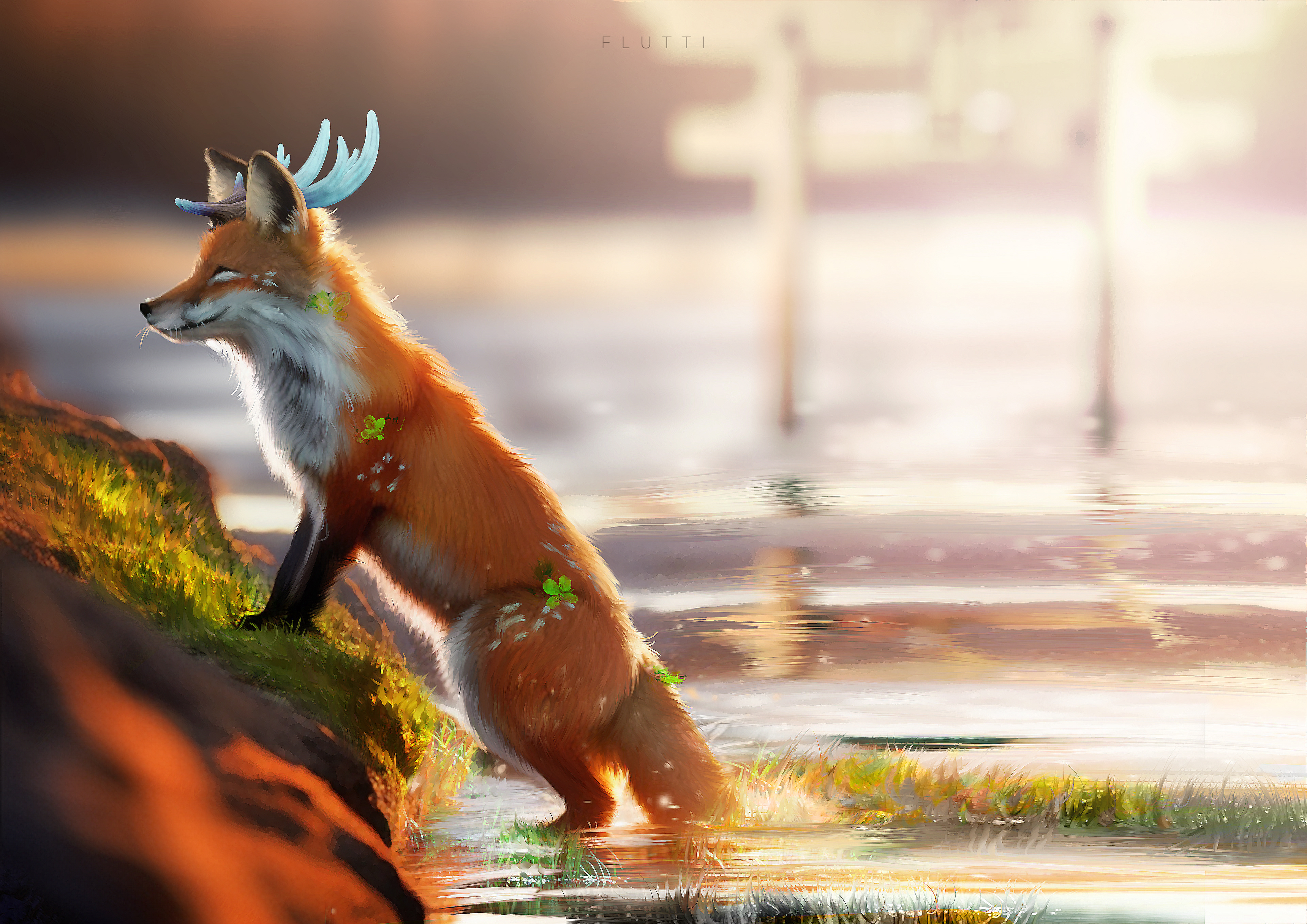 "A mythical creature with botanimalic and elemental magic qualities. As an avatar incarnation of life, her heart is filled with full of happiness, curiosity and positivity cheerfulness. This ancient spirit feels deeply connected attached to the faunal, herbal and aquatic biosphere. Endowed with the gifts of nature, her abilities comprise inter alia the growth of plants, underwater respiration and natural restoration regeneration of nature. When applying availing herself of her magical powers, her body is surrounded by blue spiritual celestial lights. As an adventurous curious soul, the ability to camouflage their identity is highly developed by local collectibles such as feathers and seasonal flowers, worn around the ear, antlers, and scattered in the fur."