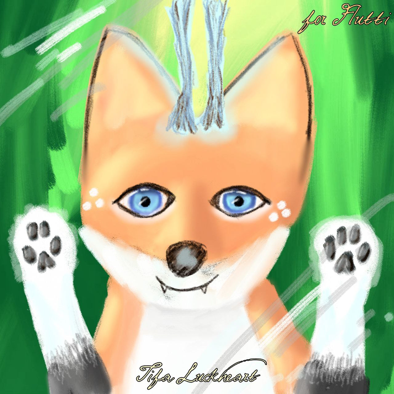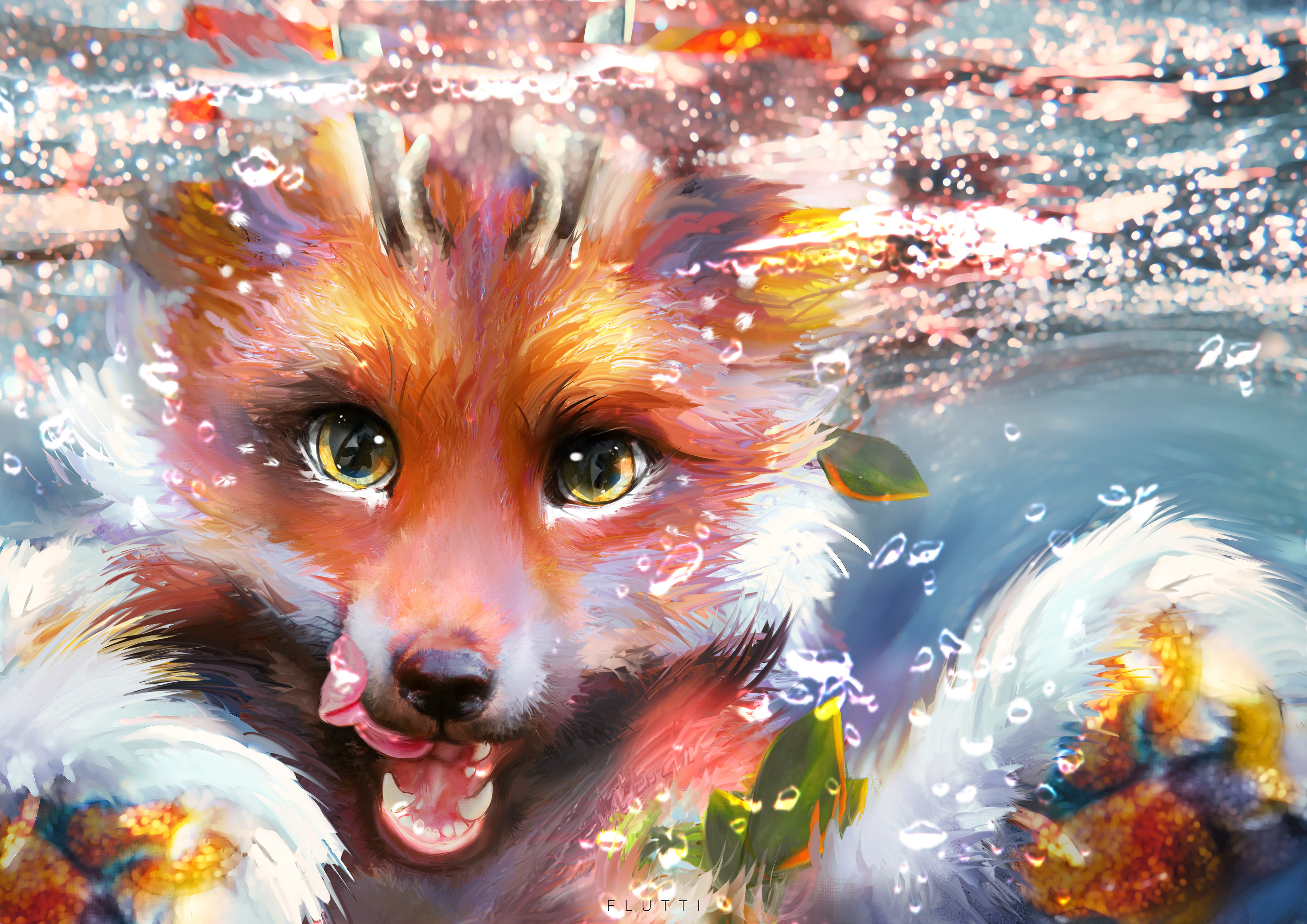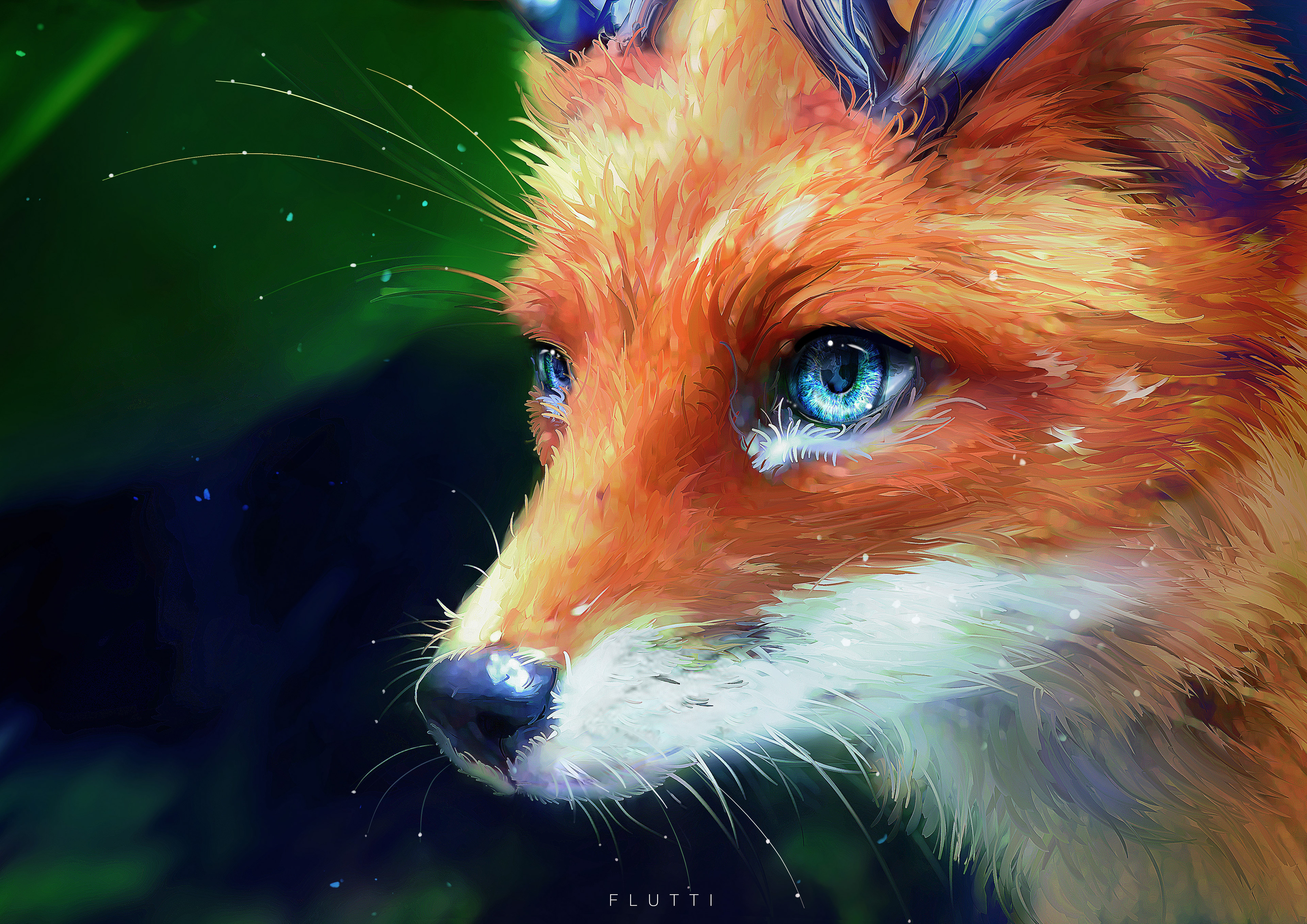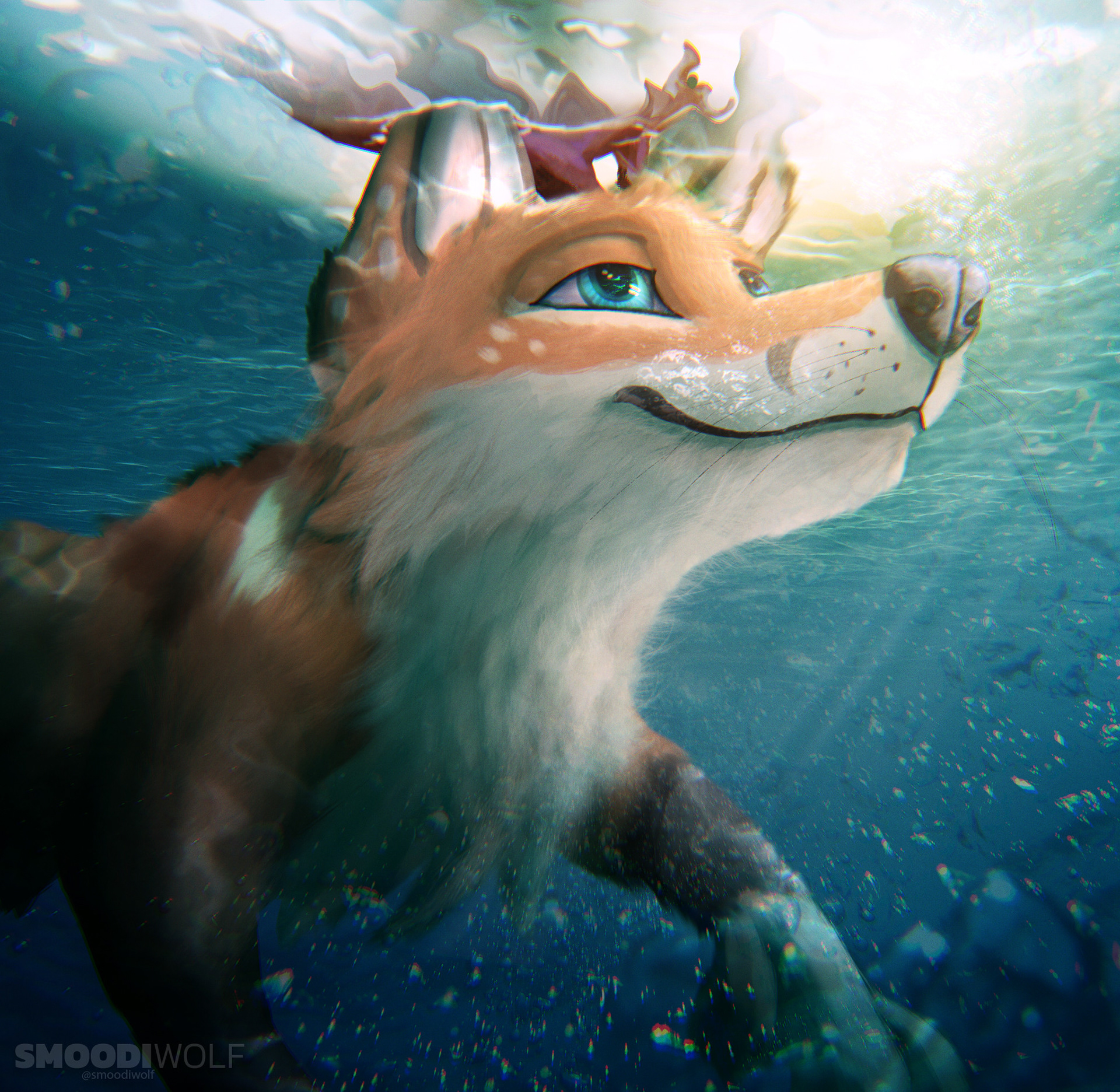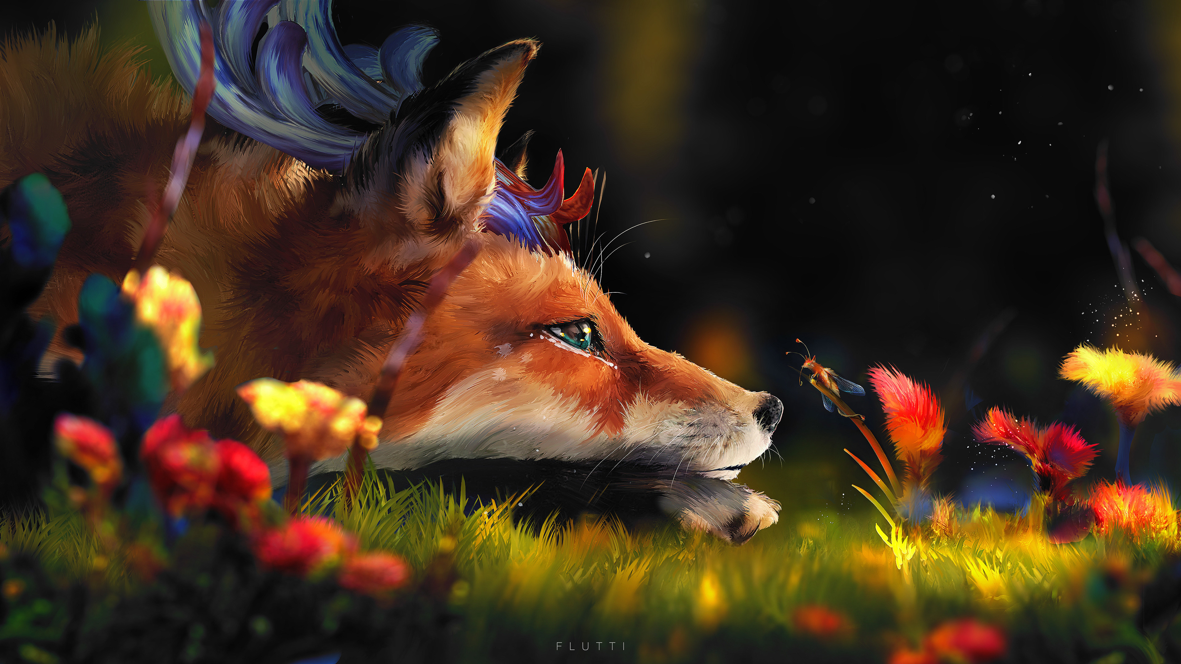 "A mythical creature with botanimalic and elemental magic qualities. As an avatar incarnation of life, her heart is filled with full of happiness, curiosity and positivity cheerfulness. This ancient spirit feels deeply connected attached to the faunal, herbal and aquatic biosphere. Endowed with the gifts of nature, her abilities comprise inter alia the growth of plants, underwater respiration and natural restoration regeneration of nature. When applying availing herself of her magical powers, her body is surrounded by blue spiritual celestial lights. As an adventurous curious soul, the ability to camouflage their identity is highly developed by local collectibles such as feathers and seasonal flowers, worn around the ear, antlers, and scattered in the fur."